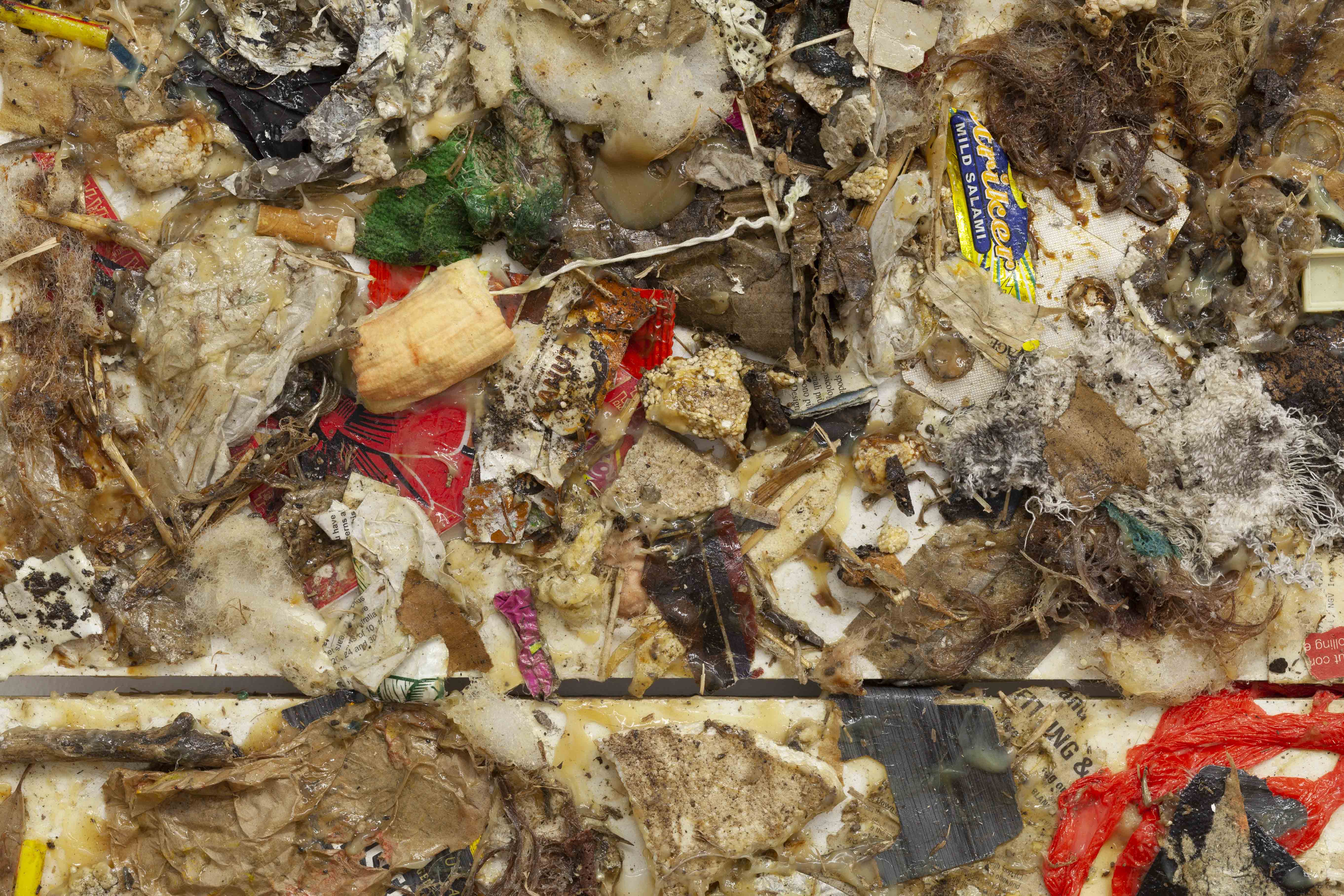 Disposal platter, 2017, objects on polystyrene, soup mix