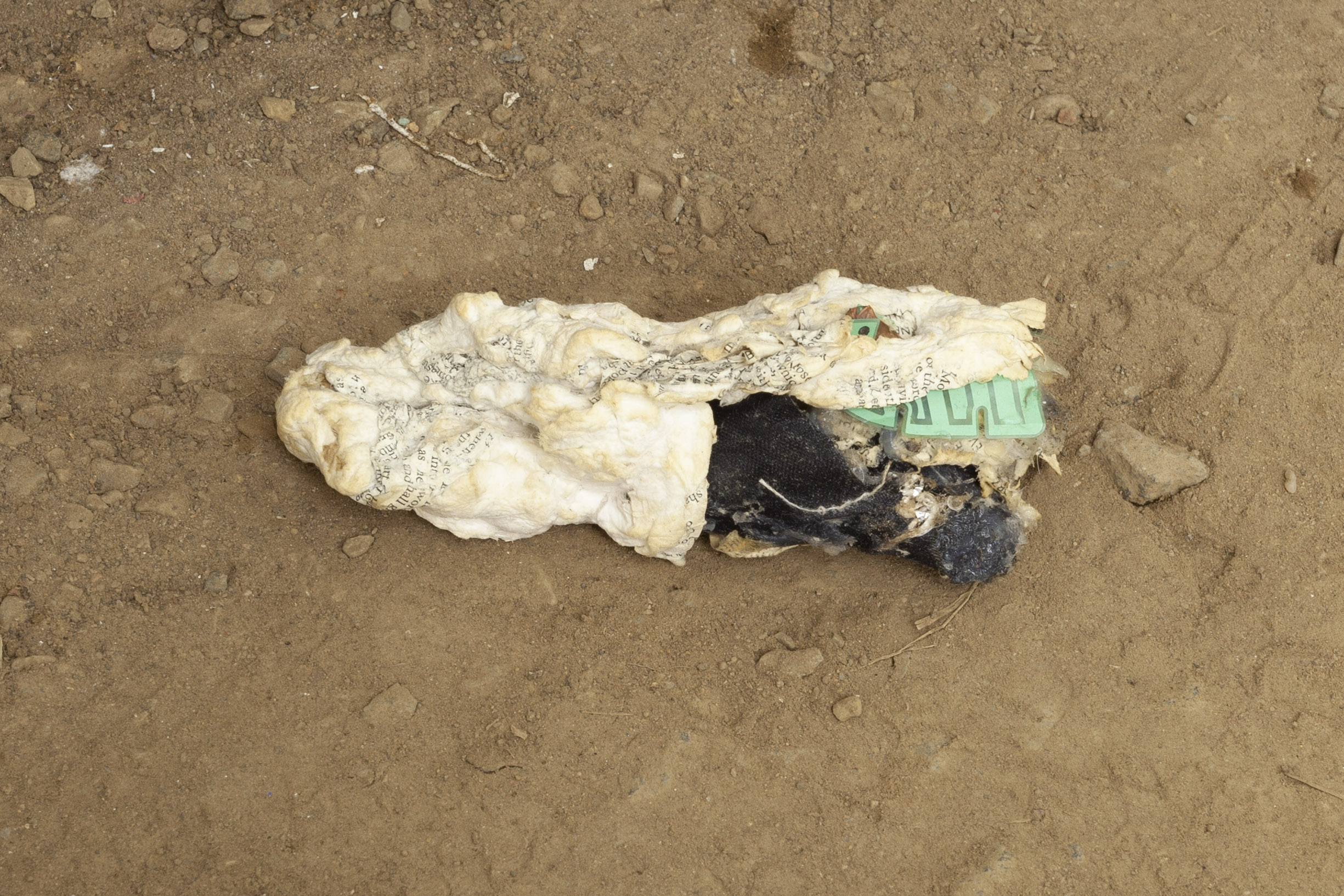 Untitled, 2015, chewed electrical parts, fabric, book pages, serviettes, silicone.