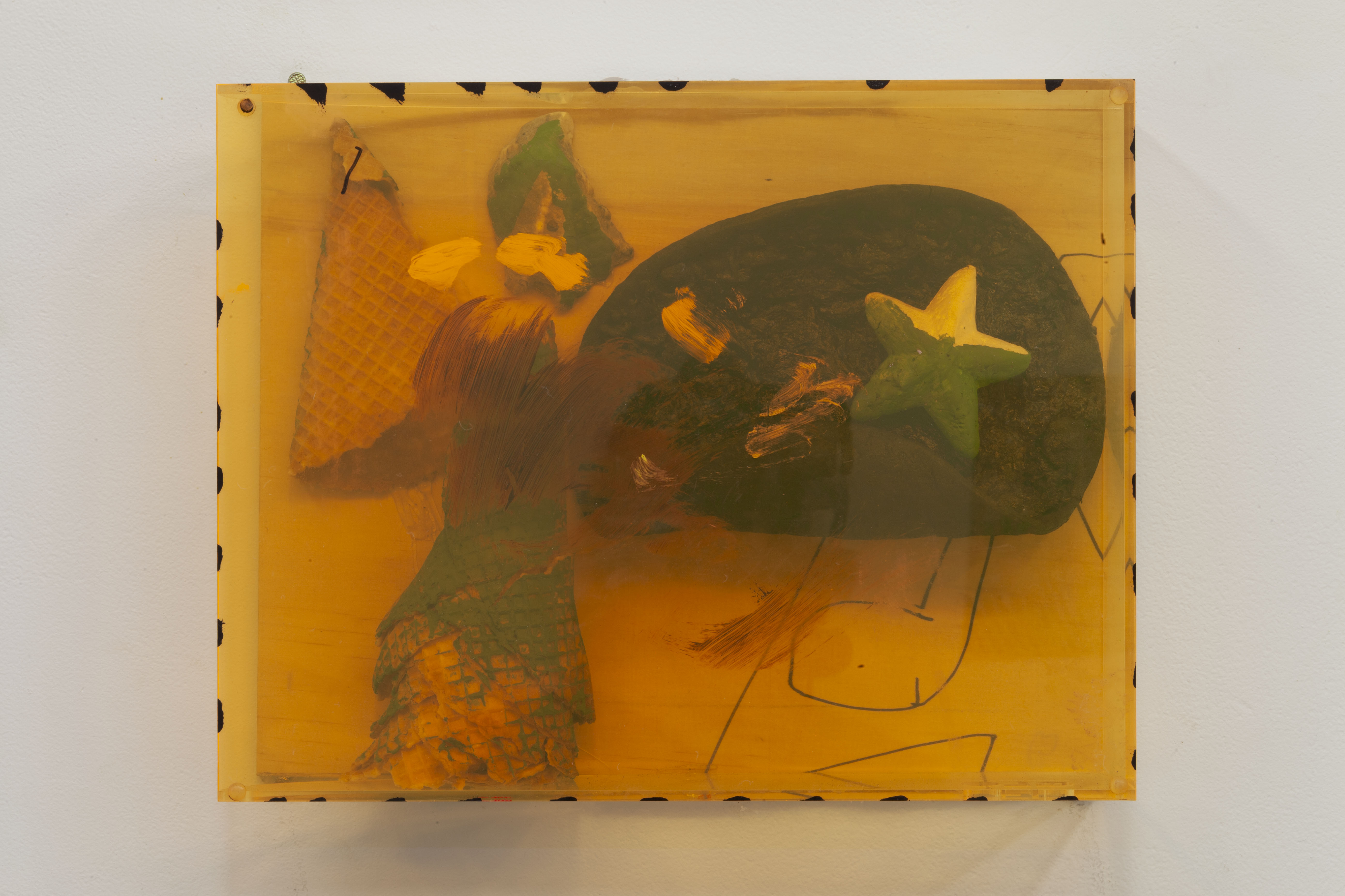 acrylic file tray, burnt pizza, oyster shell, wood, permanent marker, styrofoam star, waffle cones, glue, acrylic paint