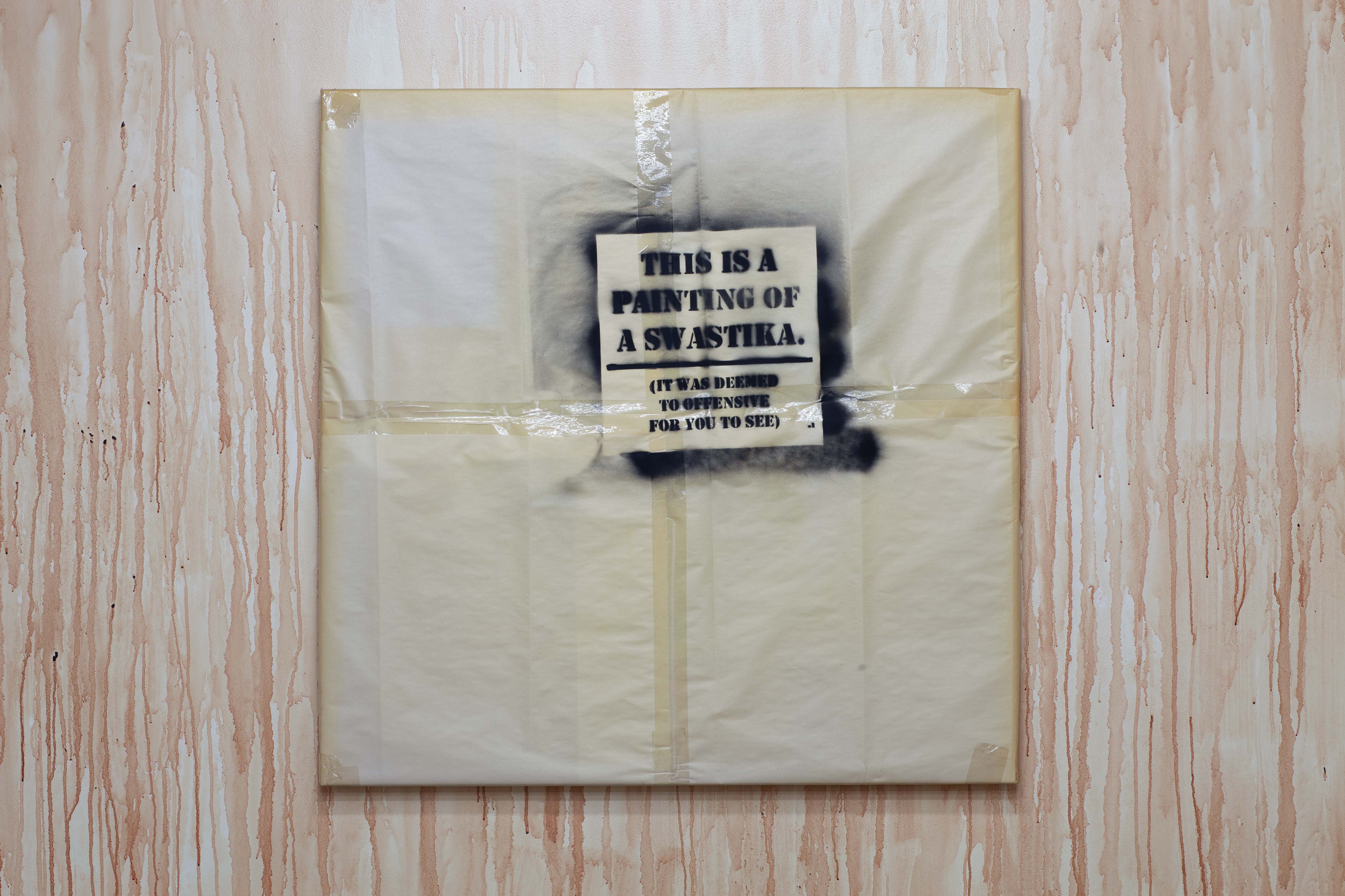 Zac Segbedzi, Swastika painting, 2016–18, spray paint, tape, butcher paper, oil on canvas